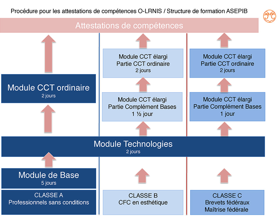 L’attestation de compétences se compose de trois modules : le module Bases, le module Technologies et un des sept modules distincts relatifs aux connaissances et capacités spécifiques au traitement (CCT) qui englobent tous les traitements nécessitant une attestation de compétences.